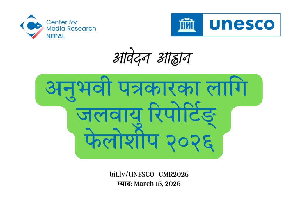 सेन्टर फर मिडिया रिसर्च–नेपालले युनेस्कोको Global Initiative for Information Integrity on Climate Change को सहयोगमा सञ्चालन गर्न लागेको अनुभवी पत्रकारका लागि जलवायु परिवर्तन रिपोर्टिङ् फेलोशीप २०२६ का लागि आवेदन आह्वान गरेको छ।