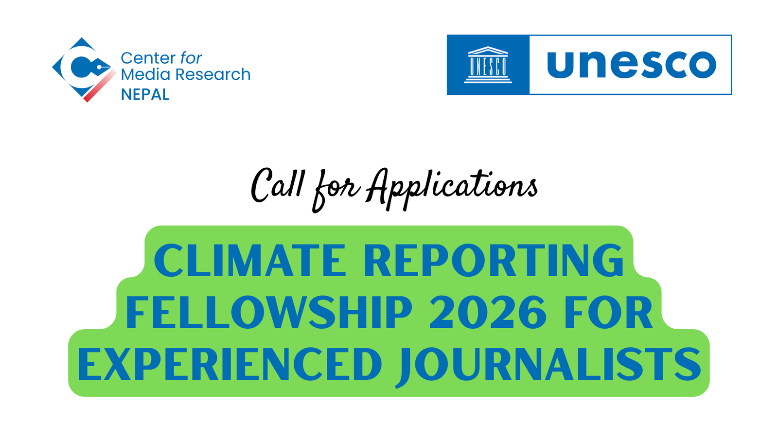 सेन्टर फर मिडिया रिसर्च–नेपालले युनेस्कोको Global Initiative for Information Integrity on Climate Change को सहयोगमा सञ्चालन गर्न लागेको अनुभवी पत्रकारका लागि जलवायु परिवर्तन रिपोर्टिङ् फेलोशीप २०२६ का लागि आवेदन आह्वान गरेको छ।