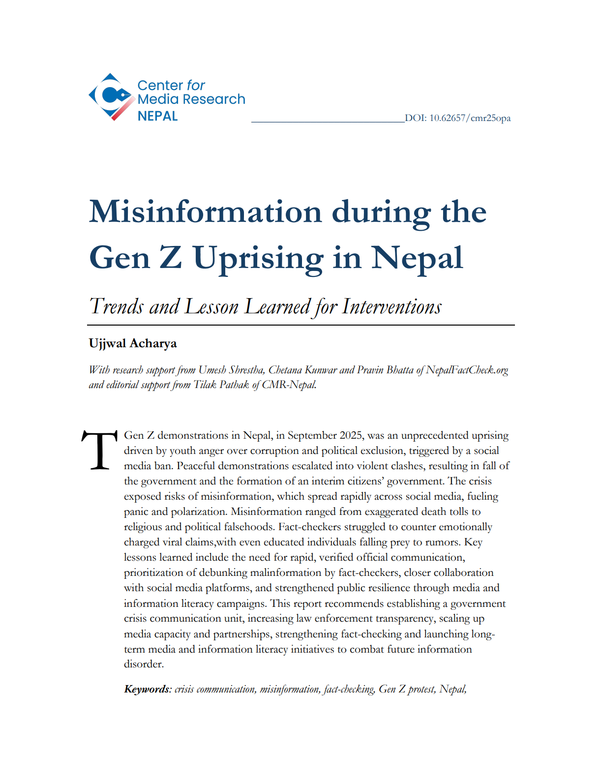 An occasional paper: The Gen Z demonstrations in Nepal, in September 2025, was an unprecedented uprising driven by youth anger over corruption and political exclusion, triggered by a social media ban. Peaceful demonstrations escalated into violent clashes, resulting in fall of the government and the formation of an interim citizens’ government. The crisis exposed risks of misinformation, which spread rapidly across social media, fueling panic and polarization. Misinformation ranged from exaggerated death tolls to religious and political falsehoods. Fact-checkers struggled to counter emotionally charged viral claims,with even educated individuals falling prey to rumors. Key lessons learned include the need for rapid, verified official communication, prioritization of debunking malinformation by fact-checkers, closer collaboration with social media platforms, and strengthened public resilience through media and information literacy campaigns.